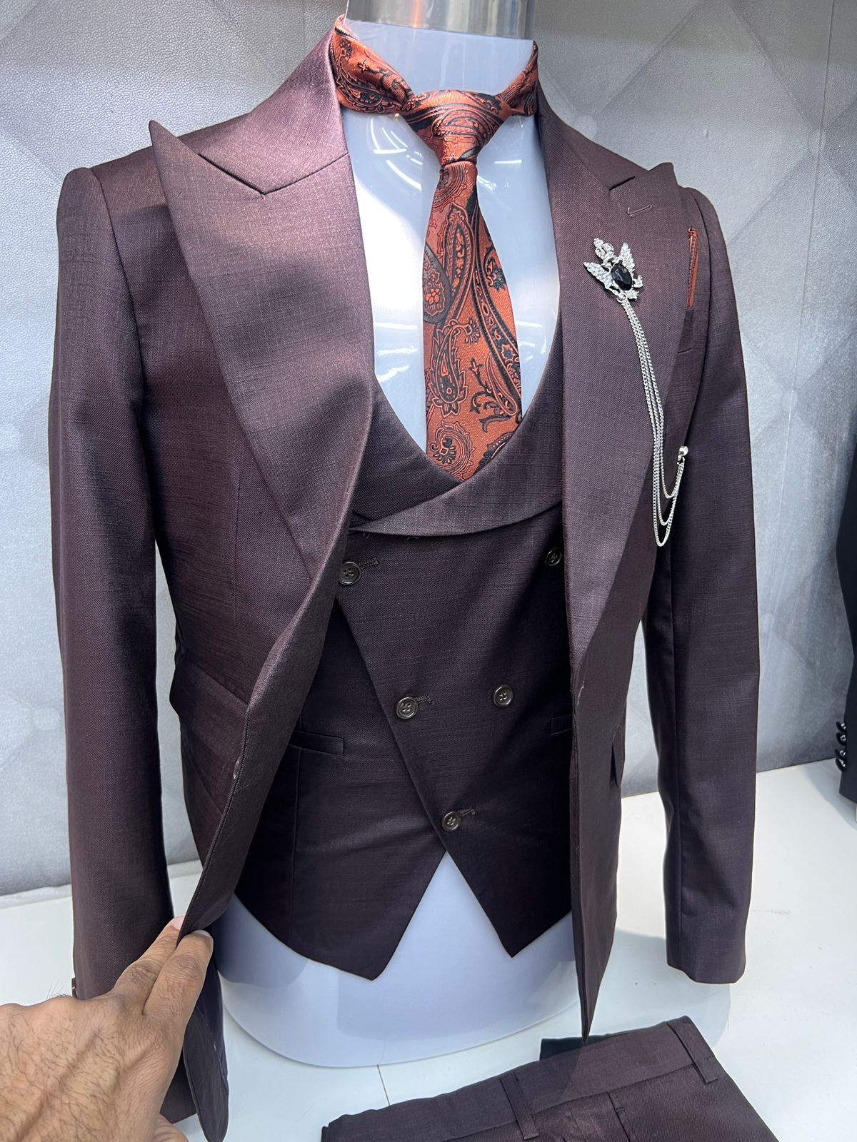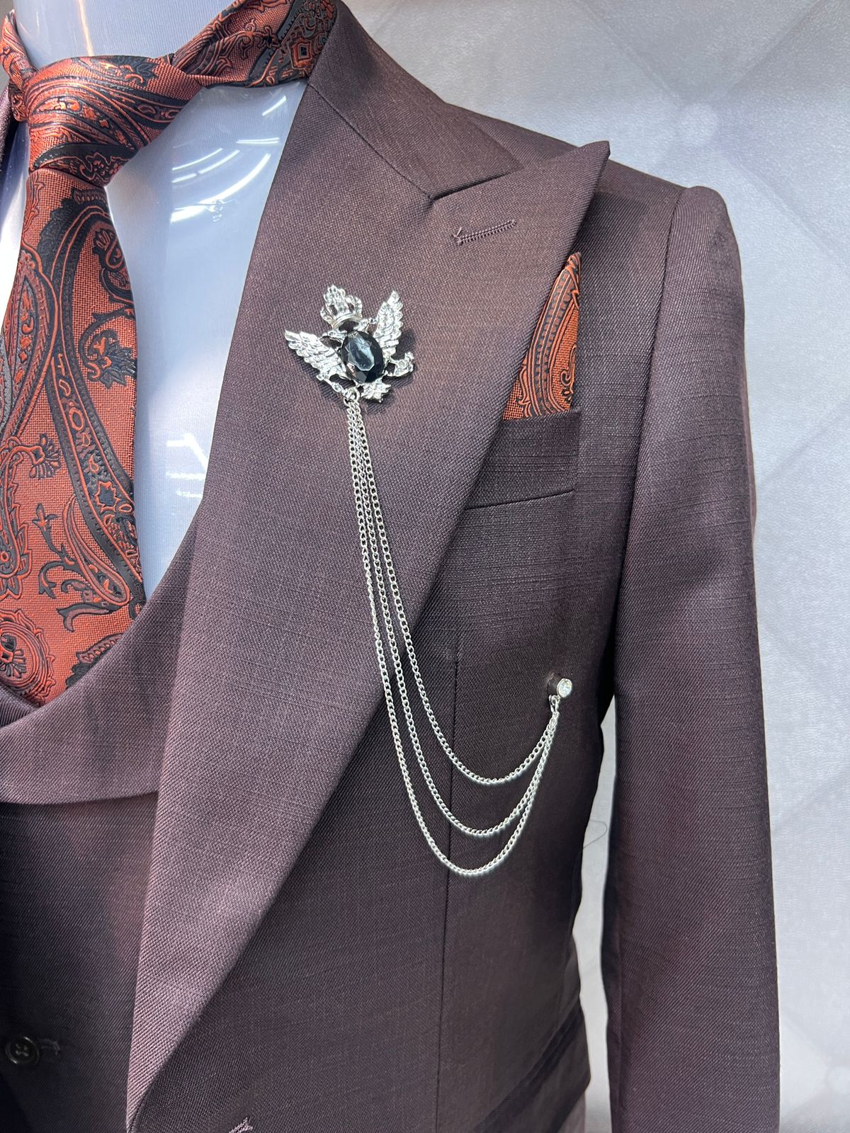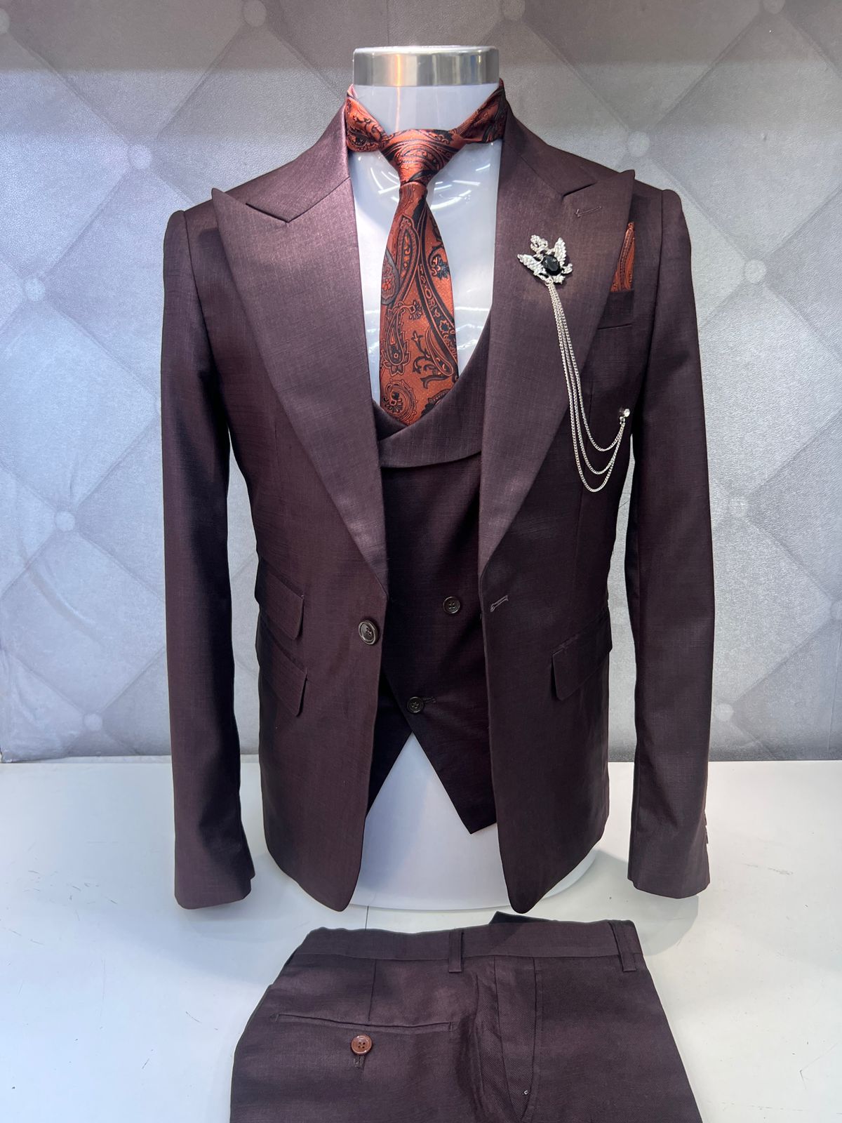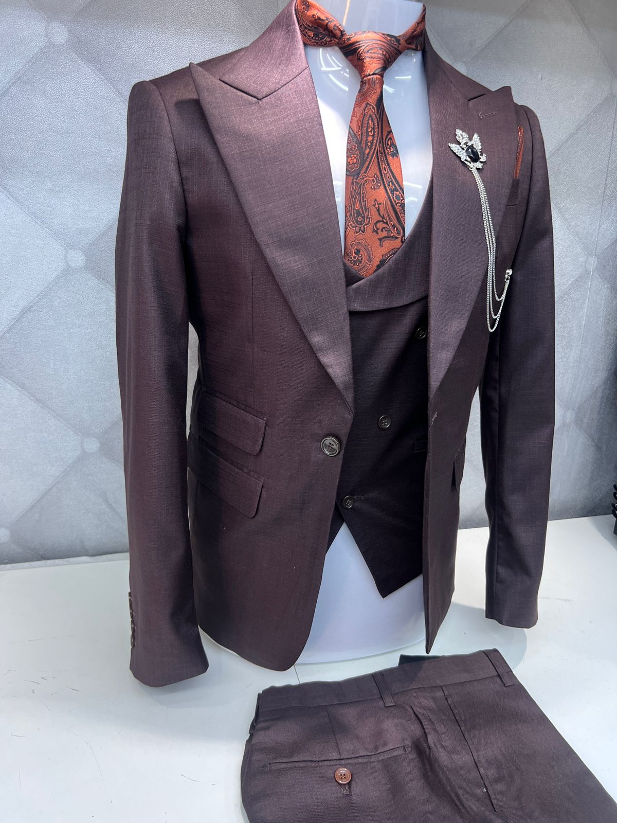Elevate your professional style with our exquisite three-piece suit, expertly crafted to make a lasting impression. This sophisticated ensemble consists of a jacket, vest coat, and trousers, all tailored to perfection with a distinctive style